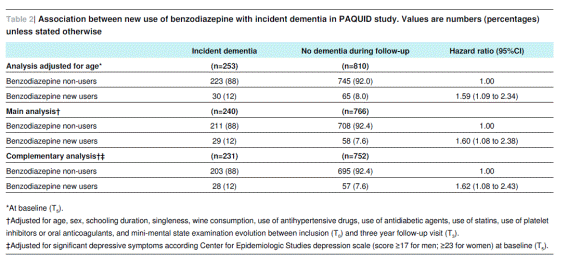 En este estudio prospectivo, con una muestra relativamente grande, y basado en la población anciana que estaba libre de demencia y no utilizaban benzodiazepinas durante al menos tres años, el inicio de consumo de benzodiazepinas se asoció con un incremento significativo de aproximadamente el 50% de incremento de riesgo de demencia. Este resultado se ha mantenido estable después de ajustar para potenciales factores de confusión, incluyendo declive cognitivo anterior al inicio del uso de benzodiazepinas y presencia de síntomas de depresión clínicamente significativos. También se mantiene robusto cuando mezclamos cinco cohortes de nuevos usuarios de benzodiazepinas a lo largo de los 15 años del periodo de seguimiento y en un estudio de casos y controles anidado complementario.