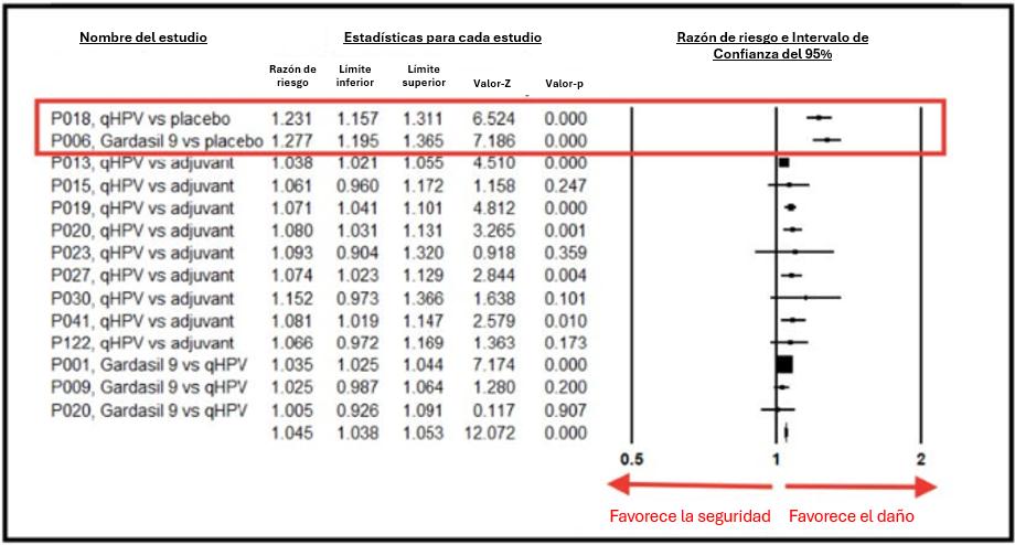 Y esos dos ensayos clínicos (que aparecen enmarcados en rojo en el cuadro de abajo) mostraron una incidencia significativamente mayor de daños, en comparación con los ensayos que en lugar de comparar con placebo utilizaron un adyuvante de aluminio o una vacuna.