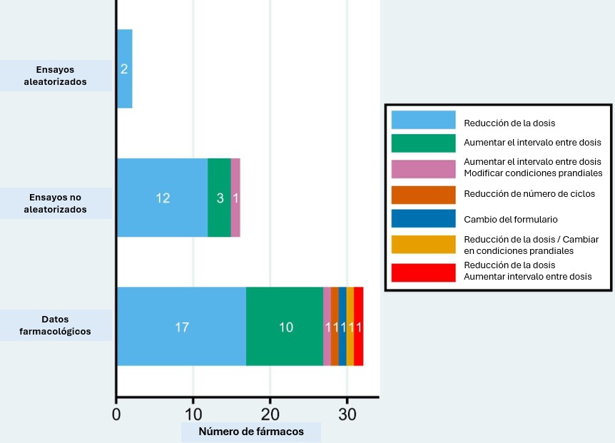 Los autores describen de forma detallada los métodos utilizados, las fuentes bibliográficas y el nivel de evidencia que sustenta sus conclusiones (véase la Figura 2). Existen múltiples enfoques para optimizar la dosificación, entre ellos la reducción de la dosis o el aumento de los intervalos de administración.