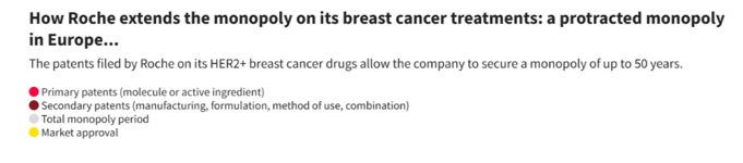 La introducción de Perjeta y Phesgo 14 y 22 años después del Herceptin, respectivamente, permitió que Roche –hoy la mayor empresa biotecnológica del mundo— extendiera su monopolio hasta 2042 en EE UU y 2039 en Europa. Si se tiene en cuenta que la primera licencia de Roche para Herceptin data de 1992, el monopolio de este producto ya tiene 50 años en EE UU y 47 en Europa. Mucho más del doble de los 20 años estipulados por el acuerdo sobre derechos de propiedad intelectual para el comercio de la Organización Mundial del Comercio (OMC).
