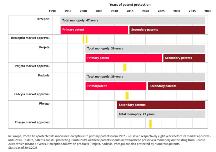 Public Eye Abusive pharma patents: Roche’s “mAb” empire. 6 de noviembre de 2025 https://www.publiceye.ch/en/topics/pharmaceutical-industry/price-of-medicines-walls-of-abusive-patents-are-standing-in-the-way-of-competition/abusive-pharma-patents-roches-mab-empire