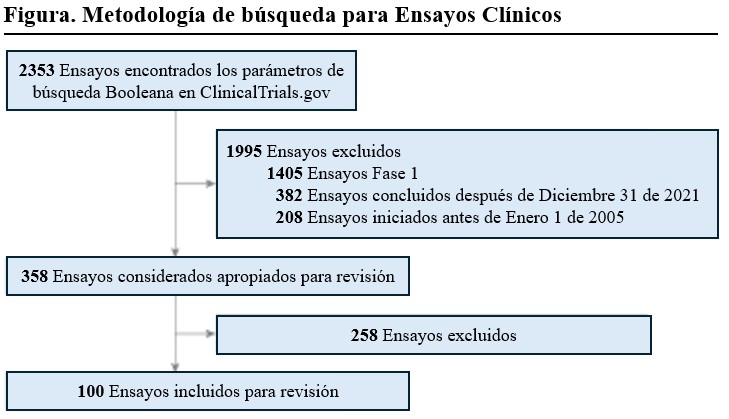 Se excluyeron los ensayos de Fase 1, así como los estudios con fecha de inicio anterior al 1 de enero de 2005 o con fecha de finalización posterior al 31 de diciembre de 2021. Los primeros 100 ensayos recuperados con estos criterios fueron incluidos en el estudio (Figura).