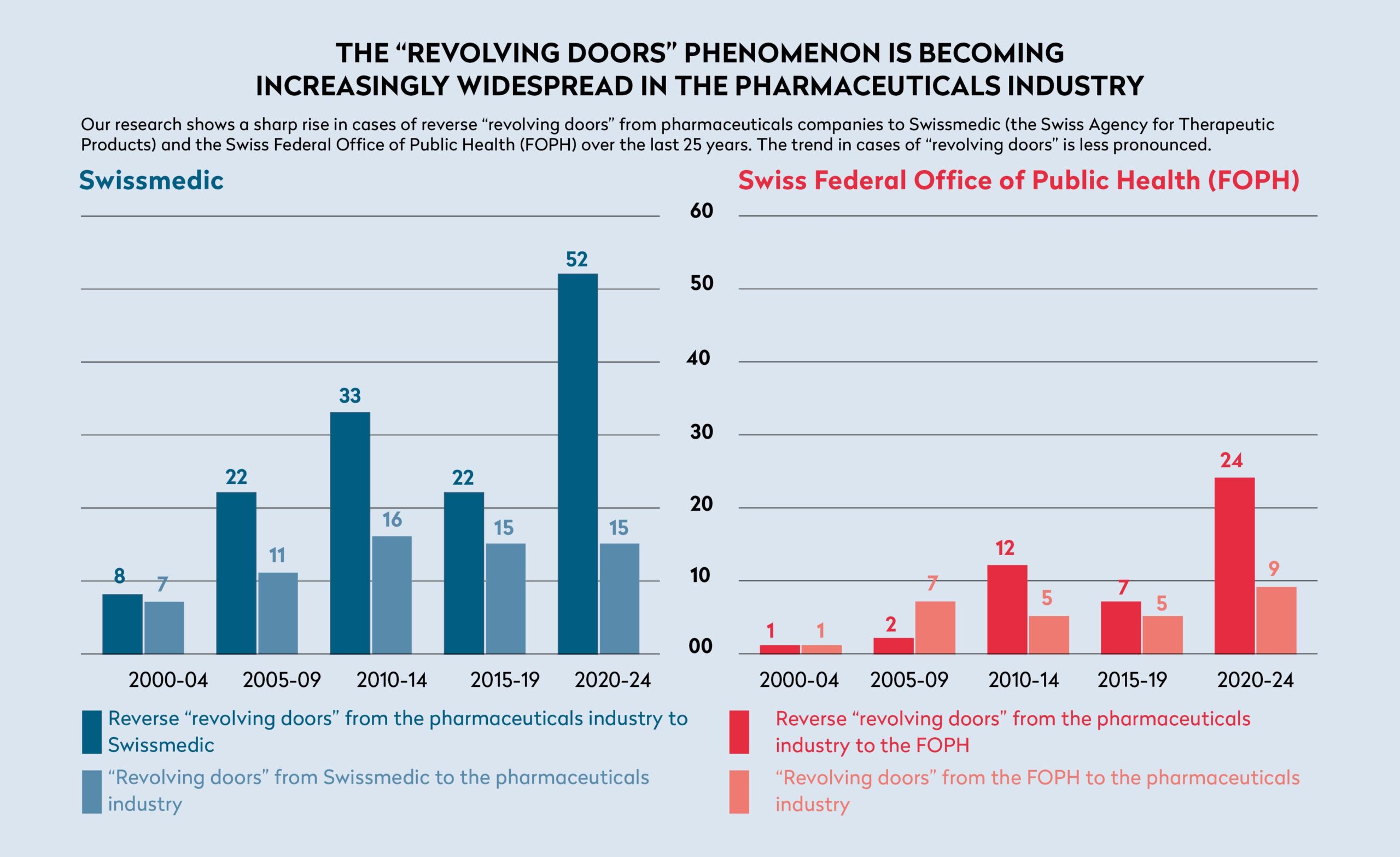 Para responder a estas preguntas hicimos, en colaboración con el grupo de investigación WAV, una investigación sin precedentes en Suiza. El objetivo era identificar casos relacionados con las “puertas giratorias” en el sector farmacéutico, es decir, transferencias de personal entre esta industria —cuya influencia política y poderosa capacidad para ejercer presión política han sido ampliamente documentadas— y dos oficinas federales encargadas de regular la política de medicamentos: Swissmedic y la OFSP.