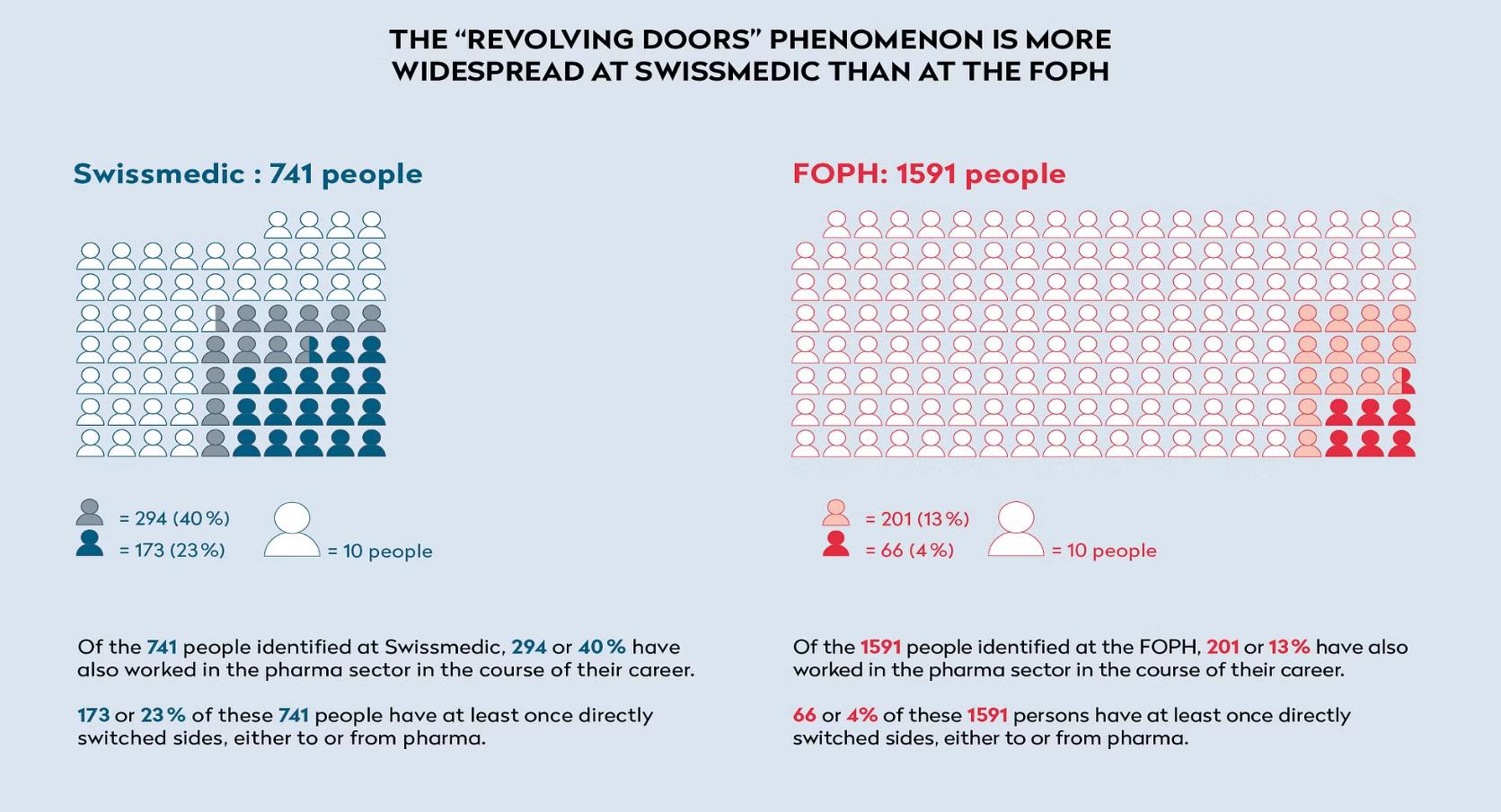 n términos generales, de las 741 personas que identificamos que habían trabajado en Swissmedic, 294 habían trabajado para al menos una empresa farmacéutica, es decir, casi el 40%. En el caso de la OFSP, cuya misión en salud pública va mucho más allá de la política farmacéutica, esta tasa fue del 13% (201 de 1.591).